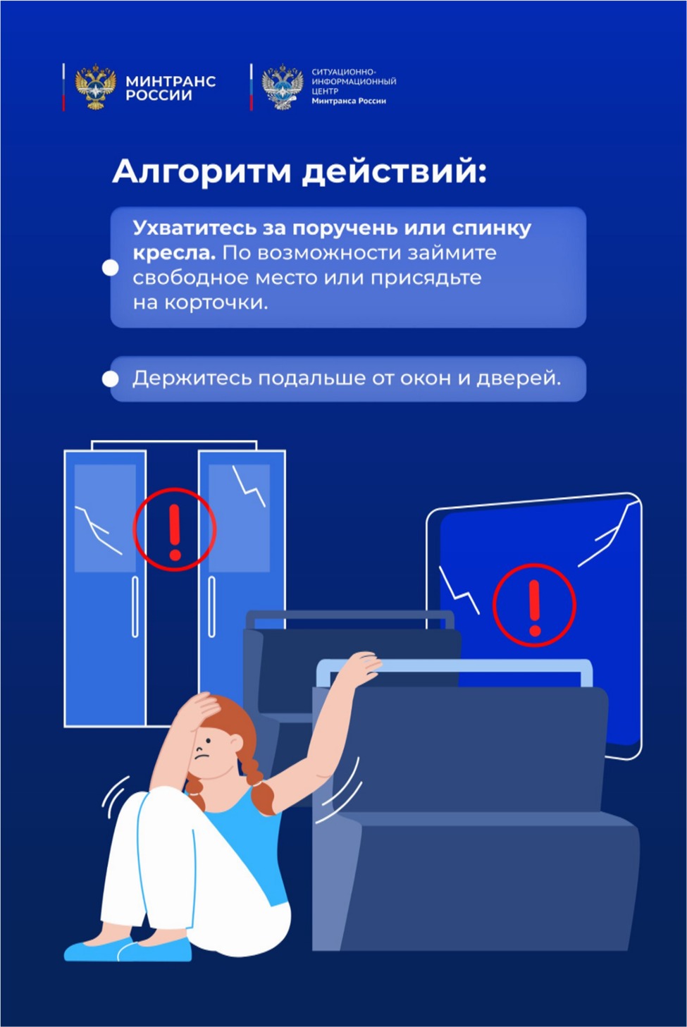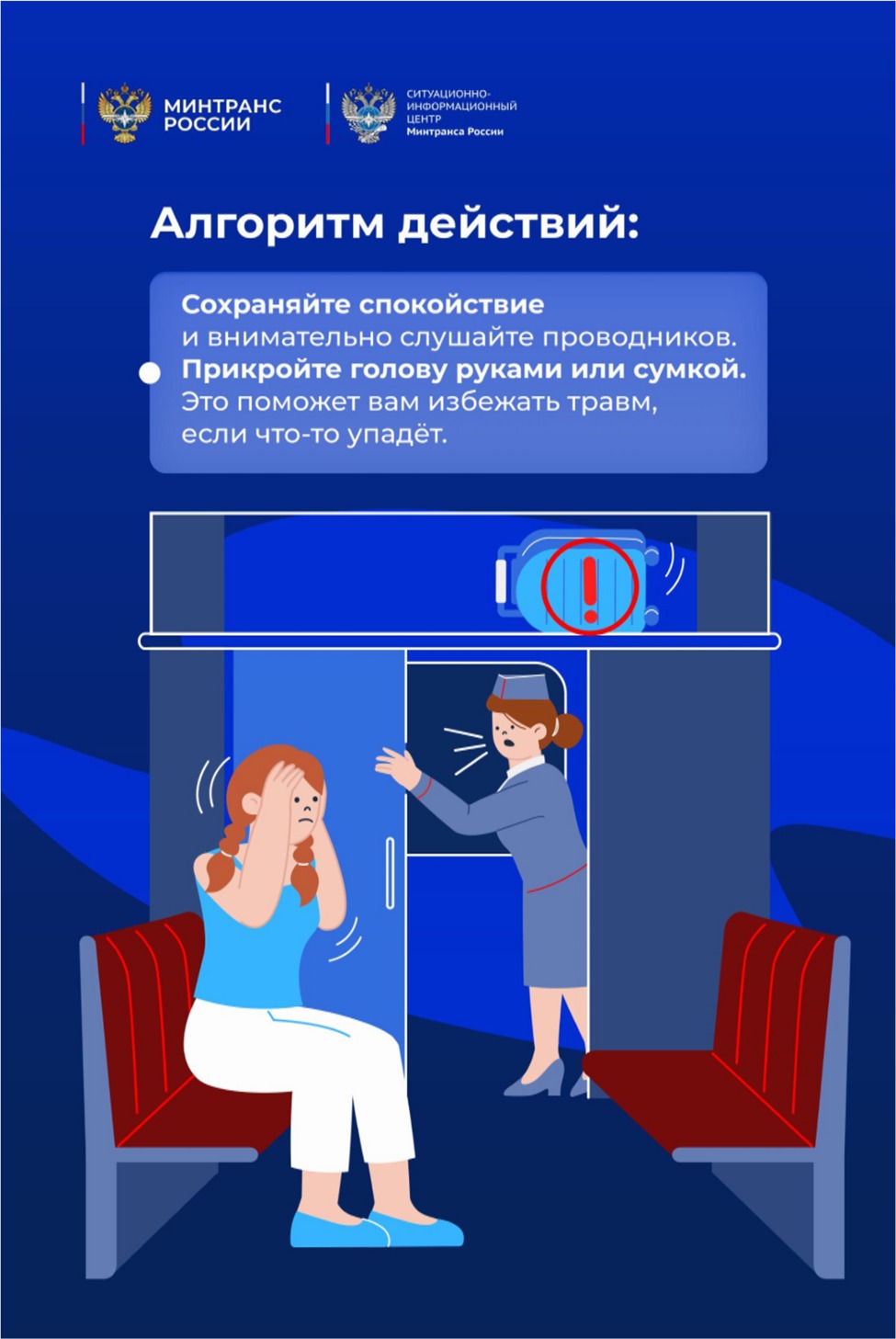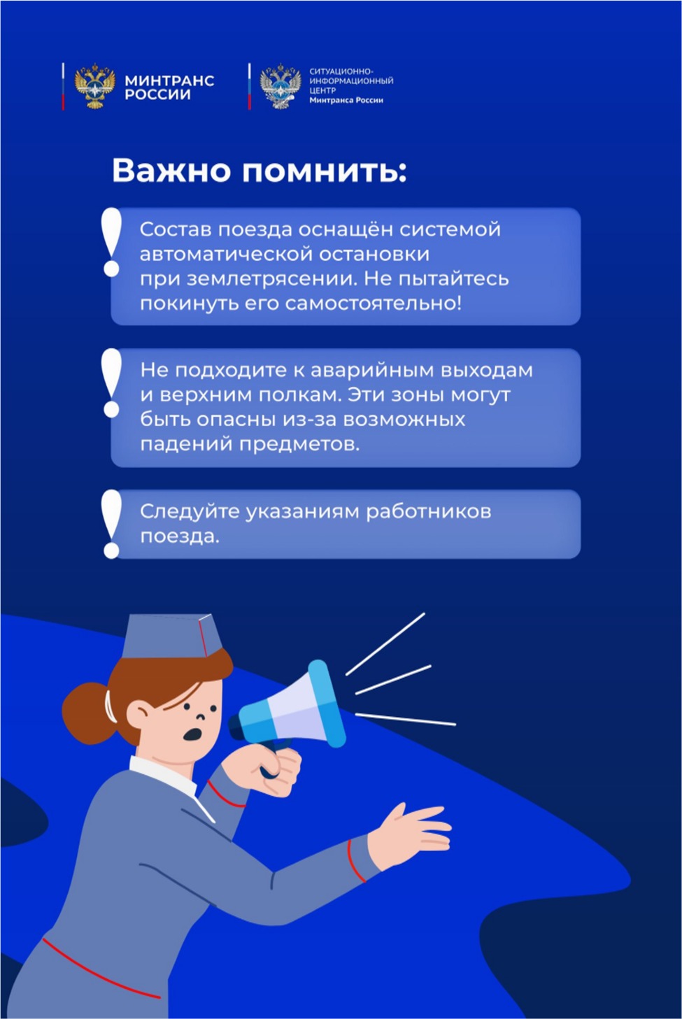 Федеральным государственным бюджетным учреждением «Стратегический исследовательский центр Минтранса России» (ФГБУ «СИЦ Минтранса России») разработана памятка о порядке действий пассажиров при возникновении чрезвычайных ситуаций, вызванных землетрясениями, во время поездок на железнодорожном транспорте.